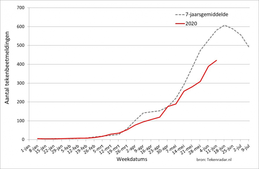 Via Tekenradar.nl zijn in 2020 8500 tekenbeten gemeld. Dit is ongeveer gelijk aan het gemiddelde van de 7 jaar daarvoor. In het voorseizoen lag het aantal meldingen wat onder het gemiddelde. Maar in juni steeg het aantal meldingen zeer sterk, tot de hoogste piek ooit sinds de oprichting van Tekenradar.nl in 2012. Deze hoge piek is vermoedelijk voor een belangrijk deel veroorzaakt door de grote aandacht voor Tekenradar begin juni. In het naseizoen lag het aantal meldingen weer onder het gemiddelde.