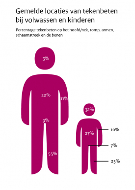 Tekenbeten bij kinderen blijken veel vaker op het hoofd en in de nek voor te komen. Het gaat om 32% van alle beten, vergeleken met 3% bij de volwassenen. Bij volwassenen komen beten op de benen veel vaker voor: 55% van alle beten en bij kinderen 25%. Beten rond de schaamstreek komen bij kinderen en volwassenen niet zo vaak voor: 7% bij kinderen en 9% bij volwassenen.