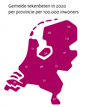 In 2020 zijn de meeste tekenbeten gemeld in Gelderland en Utrecht, en de minste in Zeeland en Flevoland. Per hoofd van de bevolking werden de meeste tekenbeten gemeld in Drenthe, en de minste in Zuid-Holland. Ongeveer 30% van alle gemelde tekenbeten in 2020 werd in de tuin opgelopen.