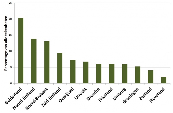In de eerste drie maanden zijn al ruim 2000 tekenbeten gemeld en meer dan 600 teken opgestuurd naar het RIVM. Dit aantal overtreft de verwachtingen. De helft van de tekenbeten is opgelopen in het bos. Opvallend is dat zo’n veertig procent van de tekenbeten is opgelopen in de tuin. Dit is bijna tien procent hoger dan tot nu toe is gevonden in het kader van De Natuurkalender (periode 2006 tot en met 2011). De meeste tekenbeten werden gemeld in Gelderland, Noord-Holland en Brabant. Vanuit Flevoland, Zeeland en Groningen werden de minste tekenbeten gemeld (zie onderstaande figuur).