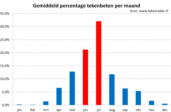 Tekenradar.nl ontvangt in juni en juli gemiddeld de helft van alle tekenbeetmeldingen in een jaar. De piek van de meldingen ligt in juli. Aangezien jaarlijks 1,3 miljoen tekenbeten vóórkomen, zullen naar verwachting de komende maand ruim 400.000 tekenbeten worden opgelopen. In de eerste helft van 2016 zijn er tot nu toe 8 procent meer tekenbeten gemeld dan het gemiddelde van de voorgaande drie jaren. De helft van alle tekenbeten dit jaar zijn in het bos opgelopen en een derde in de tuin. Een derde van de gemelde tekenbeten zijn opgelopen tijdens het wandelen, 20 procent tijdens het tuinieren en 20 procent van de tekenbeten bij het spelen. Het aantal tekenbeetmeldingen hangt in belangrijke mate samen met de weersomstandigheden. Daarnaast speelt de aandacht voor Tekenradar.nl waarschijnlijk een rol.
