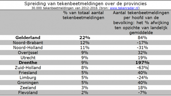 Van de in totaal ruim 30.000 tekenbeetmeldingen tussen 2012 en 2016 komen de meeste uit Gelderland. Ongeveer 22% van de meldingen komen uit deze provincie. Als je het aantal tekenbeetmeldingen weegt per aantal inwoners, blijkt dat inwoners uit Drenthe het grootste risico lopen op een tekenbeet. Het gaat om bijna drie keer zo veel tekenbeetmeldingen per inwoner als gemiddeld in Nederland.